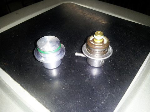 これは(右) ノーマルのフューエルレギュレター! とても小さい! これでは安定した燃圧は無理でしょう” ノーマルはあくまでもブーストもあげませんし 馬力もそこそこですので こんなんでいいのでしょう!